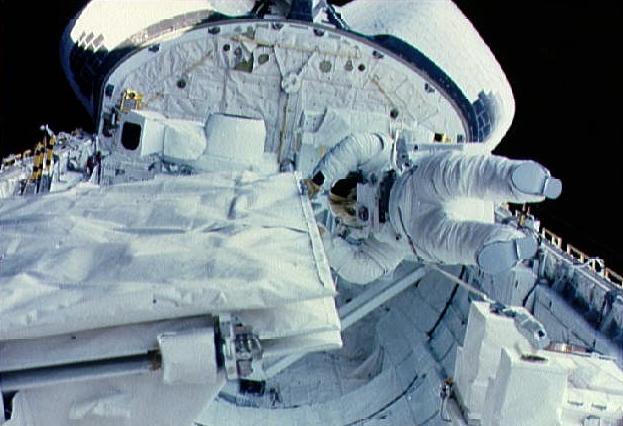 refueling the satellite in the cargo bay by an EVA of Sullivan and Leestma