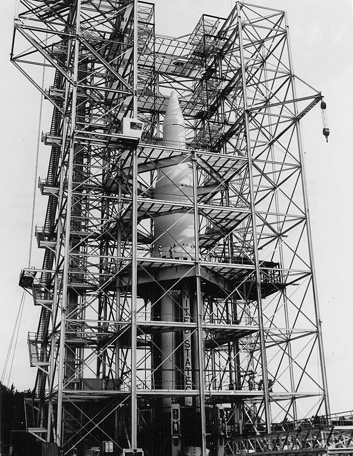 ![]() The S-1 stage for the SA-1 mission is being installed on the launch pad for its oct 27, 1961 launch; Credit: NASA |