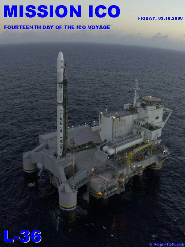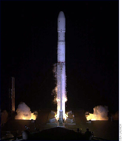 On the third mission, lifting the 6,050 lb (2,750 kg) ICO F-1 communications satellite to Medium Earth Orbit on March 12, 2000, an anomaly developed during the operation of the second stage. The rocket failed to reach orbital velocity. Approximately eight minutes into the mission, the flight was terminated. An investigation is underway under the Sea Launch Failure Review Oversight Board. Return to Flight is expected in the Summer of 2000. |