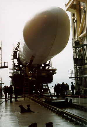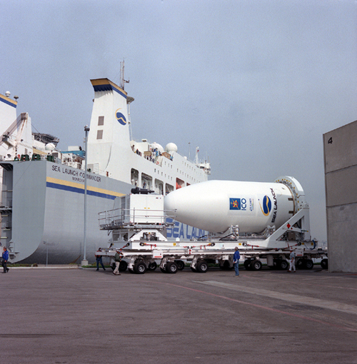 On February 18, the sea Launch team transported the encapsulated ICO communications satellite from the Payload Processing Facility at Home Port to the assembly and command ship, docked nearby. The payload traveled up an extended ramp that leads to the rocket assembly plant along the length of the ship. Here, the payload was mated with the launch vehicle and prepared for transfer to the launch platform. |