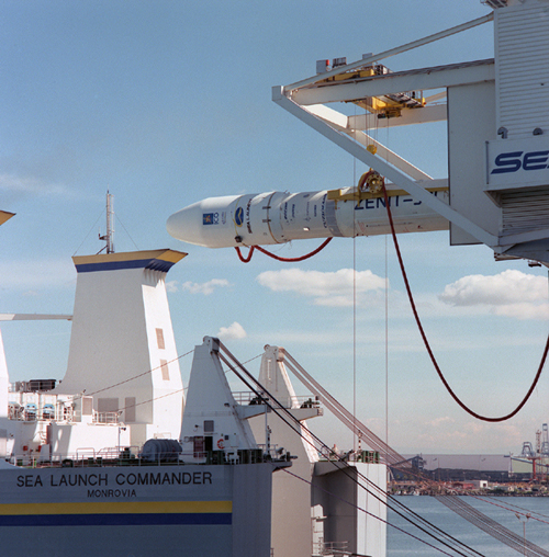 On Feb. 24th, the Sea Launch team transferred the fully integrated launch vehicle from the assembly and command ship to the launch platform. |