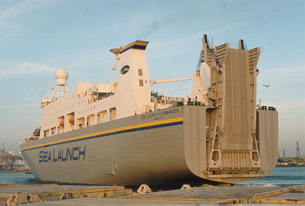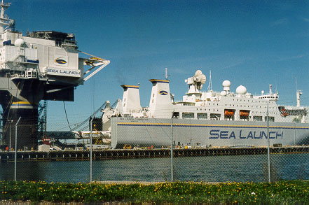 Fully supplied and ready for its mission, the Sea Launch Commander departs from the Home Port on Feb. 26th. It remained outside the breakwater at Long Beach, Calif., overnight to allow for additional communications testing with Odyssey launch platform, still docked at Home Port, three miles away. |