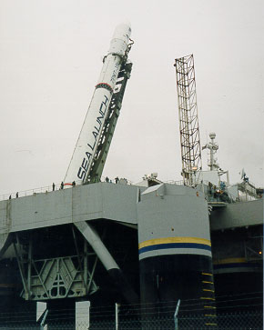 During the lift test at Home Port, the Sea Launch Team tests all systems for launch readiness. On Feb. 25th, the launch vehicle remained in the vertical position for about 12 hours. |
