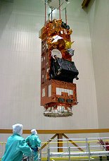 is hoisted from the Ariane 5 building's clean room preparation