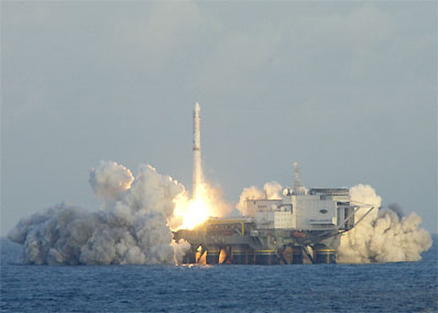 ![]() The Zenit rocket lifts off from the Odyssey launch platform. Credit: Sea Launch |