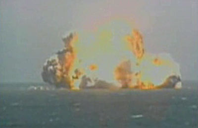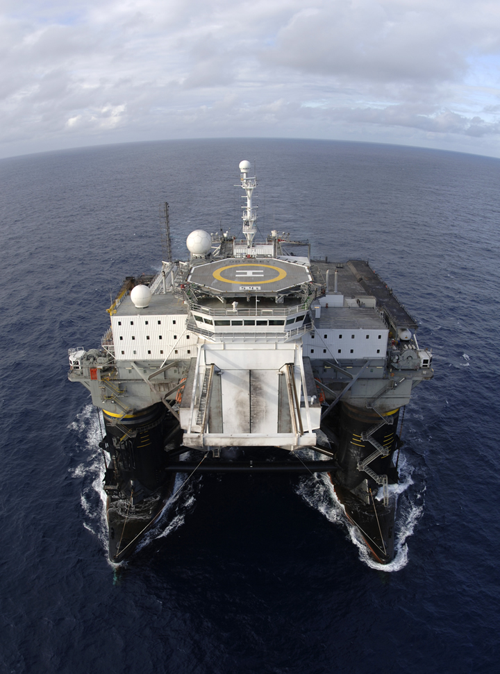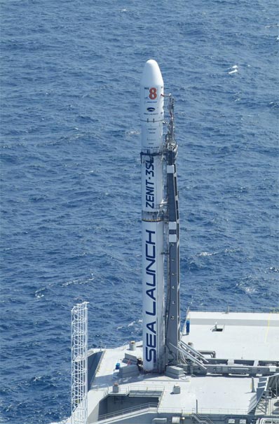 The Zenith 3SL rockety stands atop the Odyssey launch platform in preparation for liftoff.