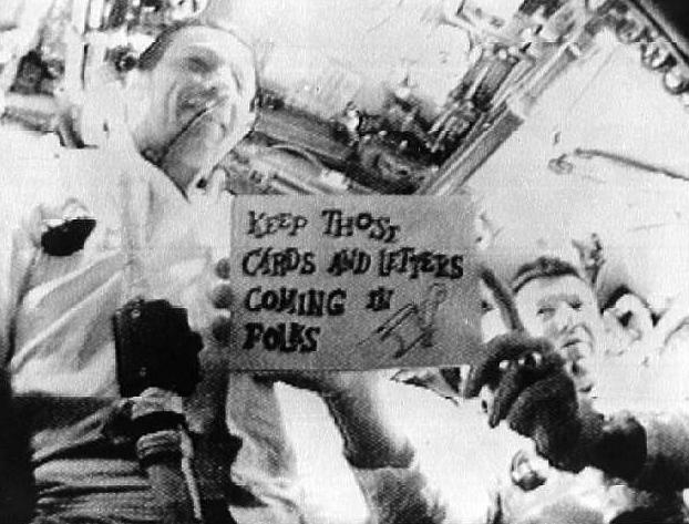 ![]() | Apollo 7 - Astronauts Schirra and Eisele seen in first live television transmission - Credit: NASA. |