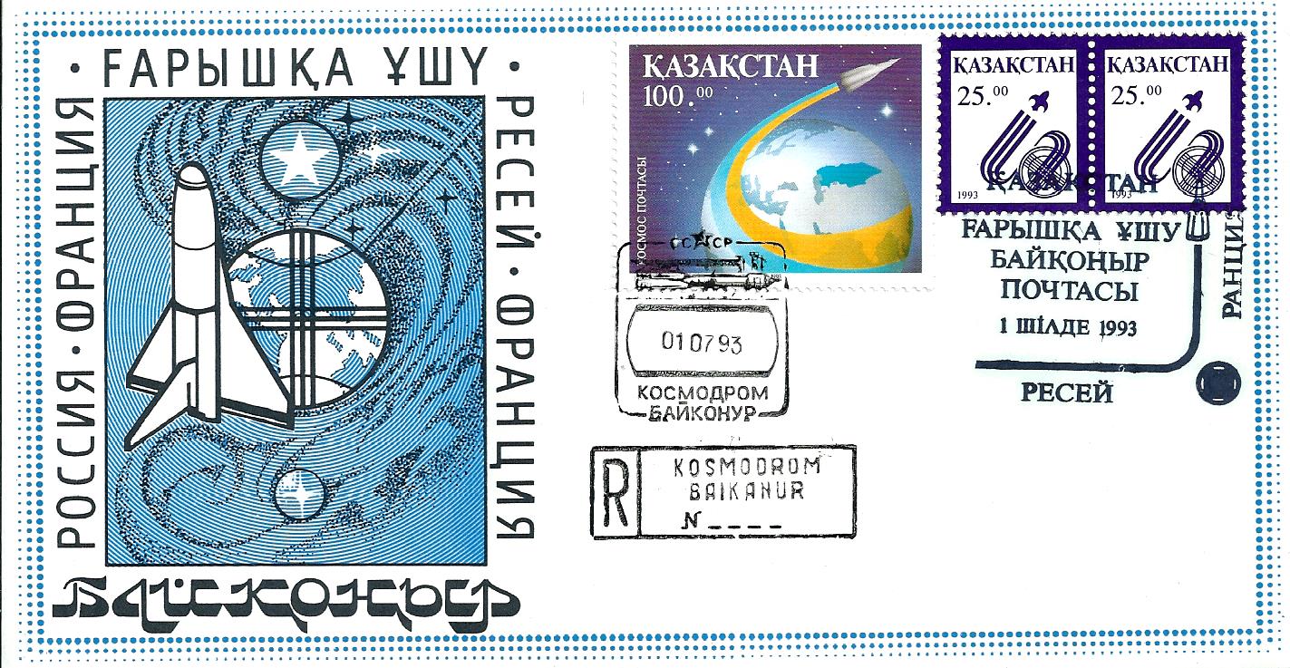 ![]() Launch cancel and special cancel Baikonur, on special cover and Kazakstan stamps. |