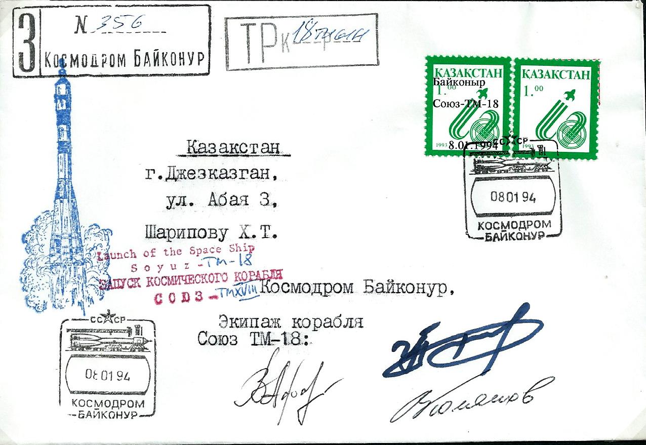 ![]() Launch cancel Baikonur and special overprint stamps with TP surtaxe cancel. Send registrated, signed by crew |