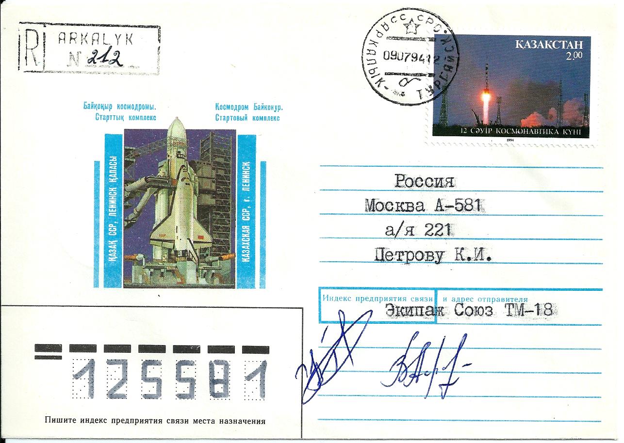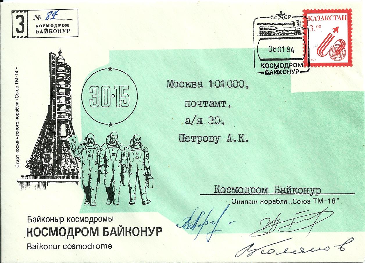 ![]() Launch cancel Baikonur on special cover 30-15 mission, sighned by crew. |