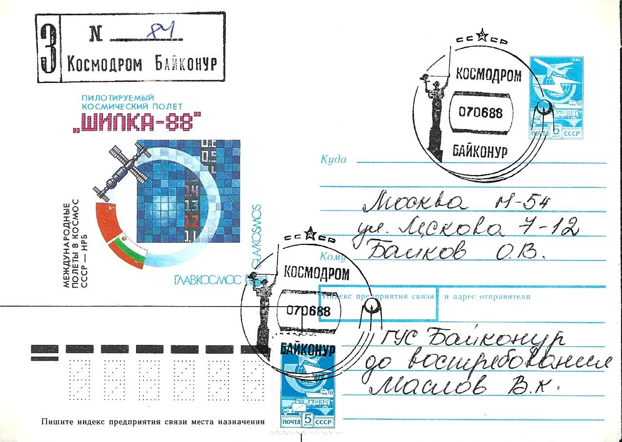 Transported to the Mir orbital station a Soviet/Bulgarian crew comprising cosmonauts A Y Solovyev, V P Savinykh and A P Aleksandrov (Bulgaria) to conduct joint research and experiments with cosmonauts V G Titov and M K Manarov. Interim orbit 343 x 282 km. Maneuvered to Mir's 355 x 349 km orbit. Docked 15:57 GMT 9 June to Mir's aft port. Moved to forward port 18 June. Undocked 22:55 GMT 5 September. Jettisoned Orbital Module 23:35 GMT 5 September. Planned landing 6 September 1988 (02:15) failed due to confusion of infrared horizon sensors. Repeat retrofire attempt one orbit later resulted in a partial burn only. The crew had to spend a tense 24 hours in the cramped Descent Module (the Orbital Module having already been jettisoned before the retrofire burn) before making last chance deorbit. Finally Lyakhov and Afghani cosmonaut Mohmand (Soyuz TM-6) returned safely to Earth and landed September 7, 1988 00:50 GMT, 160 km SE Dzhezkazgan.