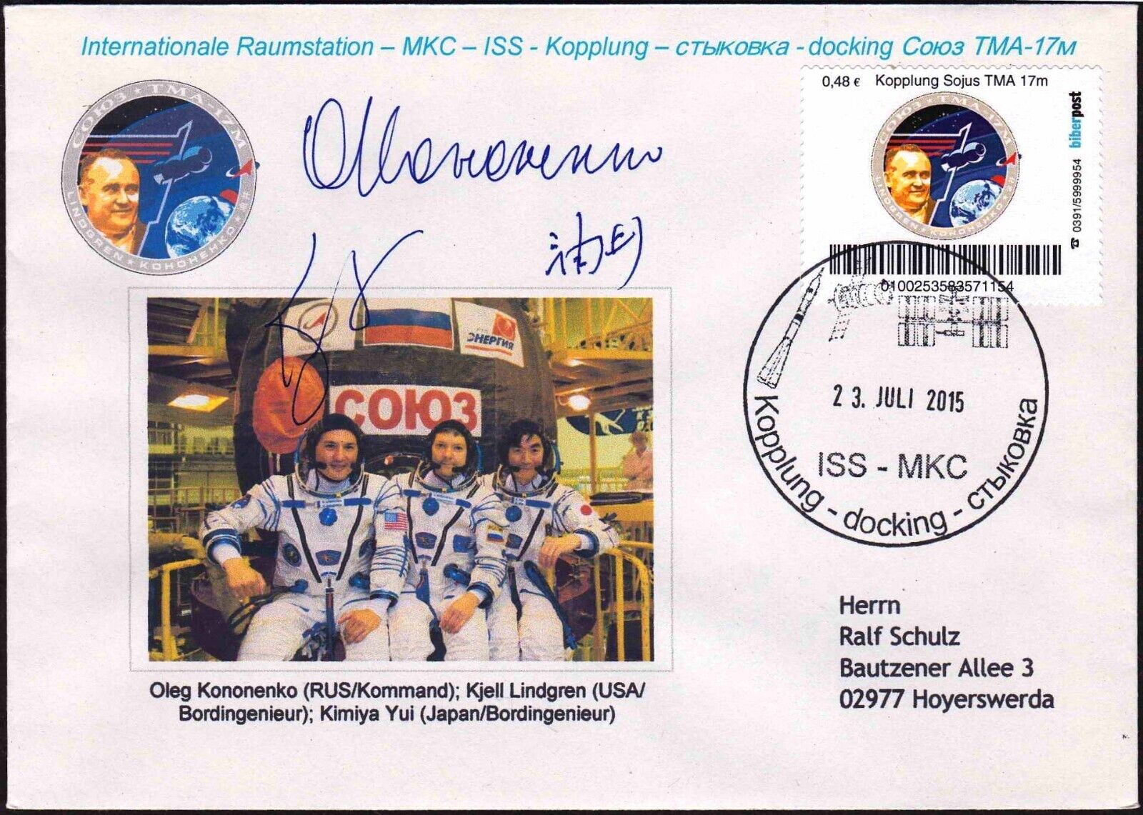 He is depicted watching the Soyuz spacecraft on its celestial voyage, trailing three red lines. They symbolize the three crewmembers,