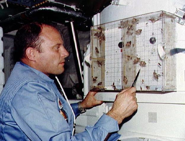STS-3 - Commander Lousma examines Insect Flight Motion Study -