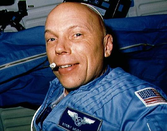 | STS-33 - STS-33 MS Musgrave, wearing headset, poses on Discovery's, OV-103's, middeck - Credit: NASA. |