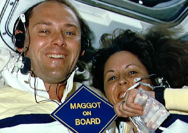 | STS-33 - STS-33 MS Carter and MS Thornton display "Maggot on Board" sign and candy - Credit: NASA. |