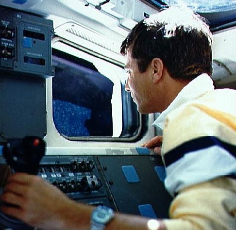 | STS-33 - STS-33 Pilot Blaha with his hand on the RHC looks out aft flight deck window - Credit: NASA. |