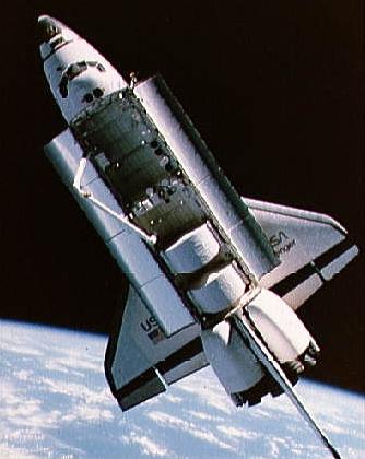 | STS-41-B - View of the Palapa-B and the Shuttle Challenger after deployment - Credit: NASA. 16,508 bytes. 346 x 346 pixels. |