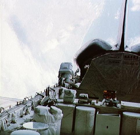 | STS-41-B - View of the Challenger from the fixed camera in McCandless's helmet - Credit: NASA. 23,857 bytes. 334 x 334 pixels. |