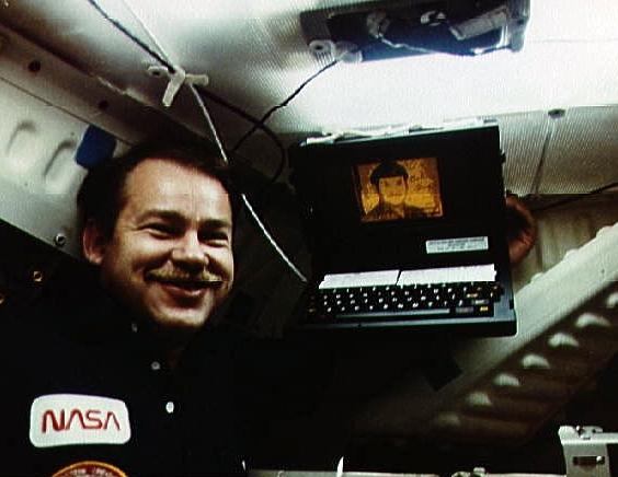 STS-51-G - Astronaut John Creighton poses with onboard GRID computer -