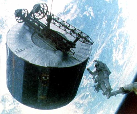 | STS-51-I - Astronaut James van Hoften working with Syncom IV-3 satellite - Credit: NASA. |