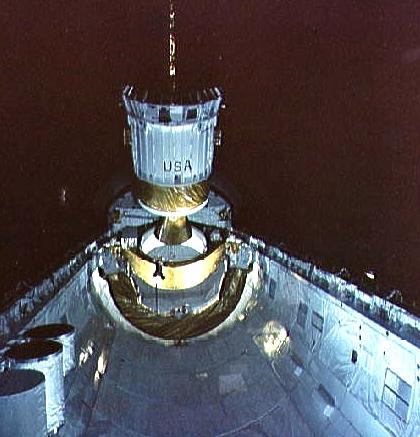 STS-6 - Deployment of the TDRS by STS-6 Challenger - Credit: NASA. Payload bay views during IUS/TDRS-A pre-deployment procedures Inertial Upper Stage (IUS) and Tracking and Data Relay Satellite (TDRS)-A is raised above payload bay (PLB) by Airborne Support Equipment (ASE) aft frame [electromechanical] tilt actuator (AFTA) to 58 degree deployment position |