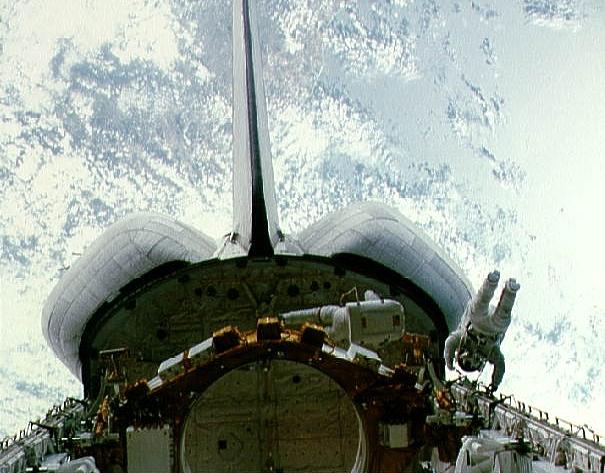 ![]() | STS-6 - MS Musgrave tethered to starboard sill longeron floats outside PLB - Credit: NASA. |