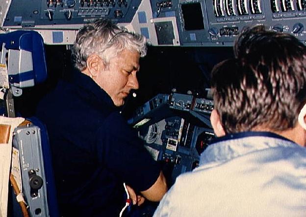 | STS-61-A - Astronauts Hartsfield and Nagel on the forward flight deck - Credit: NASA. 50,604 bytes. |