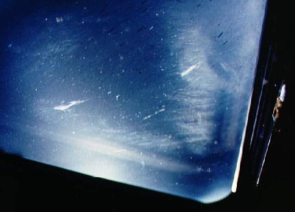 ![]() Crew compartment flight deck window debris, damage, streak documentation - Credit: NASA. |