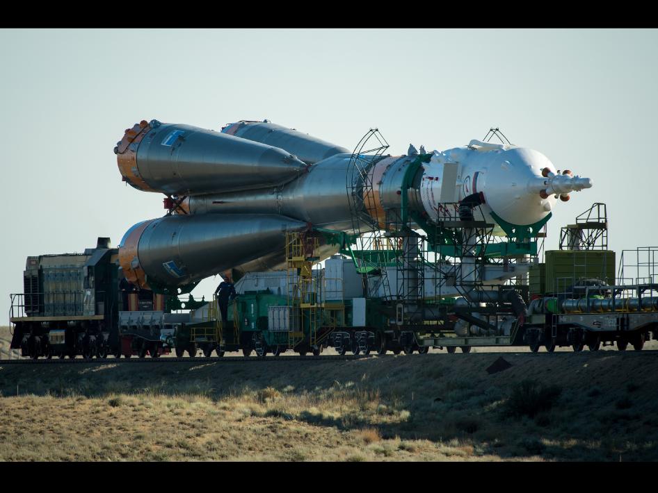 ![]() The Soyuz TMA-09M spacecraft is rolled out by train to the Baikonur Cosmodrome launch pad, Sunday, May 26, 2013, in Kazakhstan. |