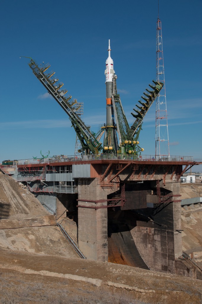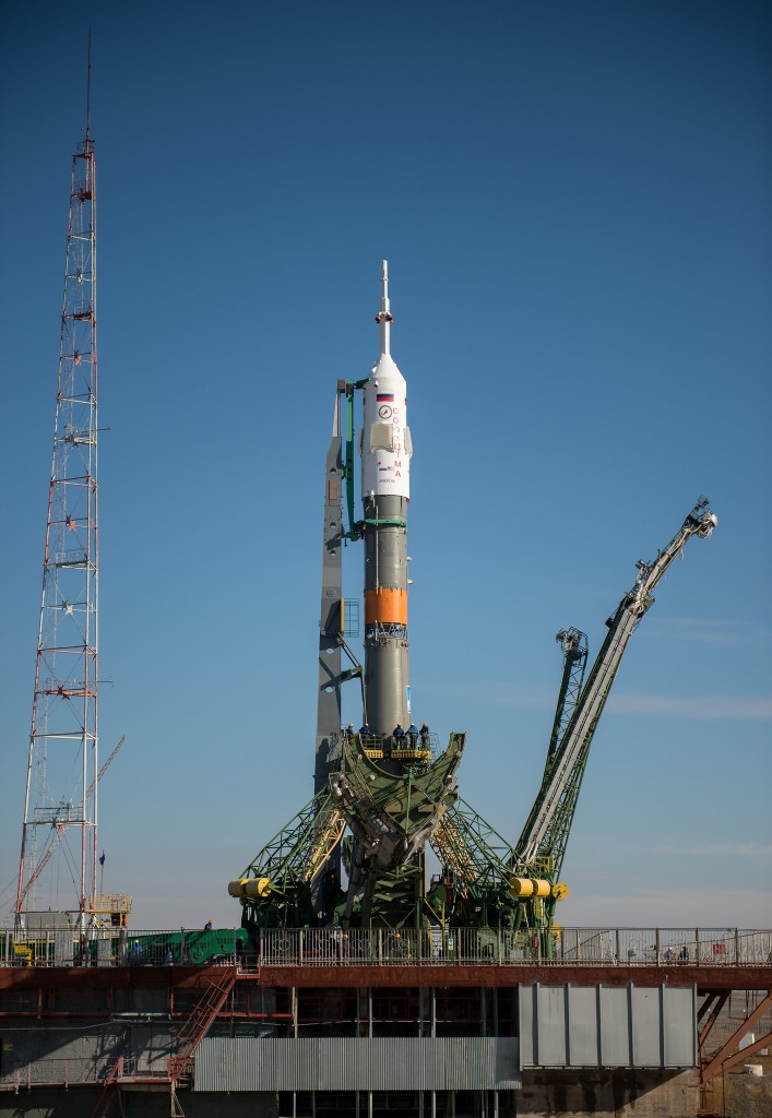 ![]() Soyuz erected on the launch site. Photo credit: NASA/Bill Ingalls |