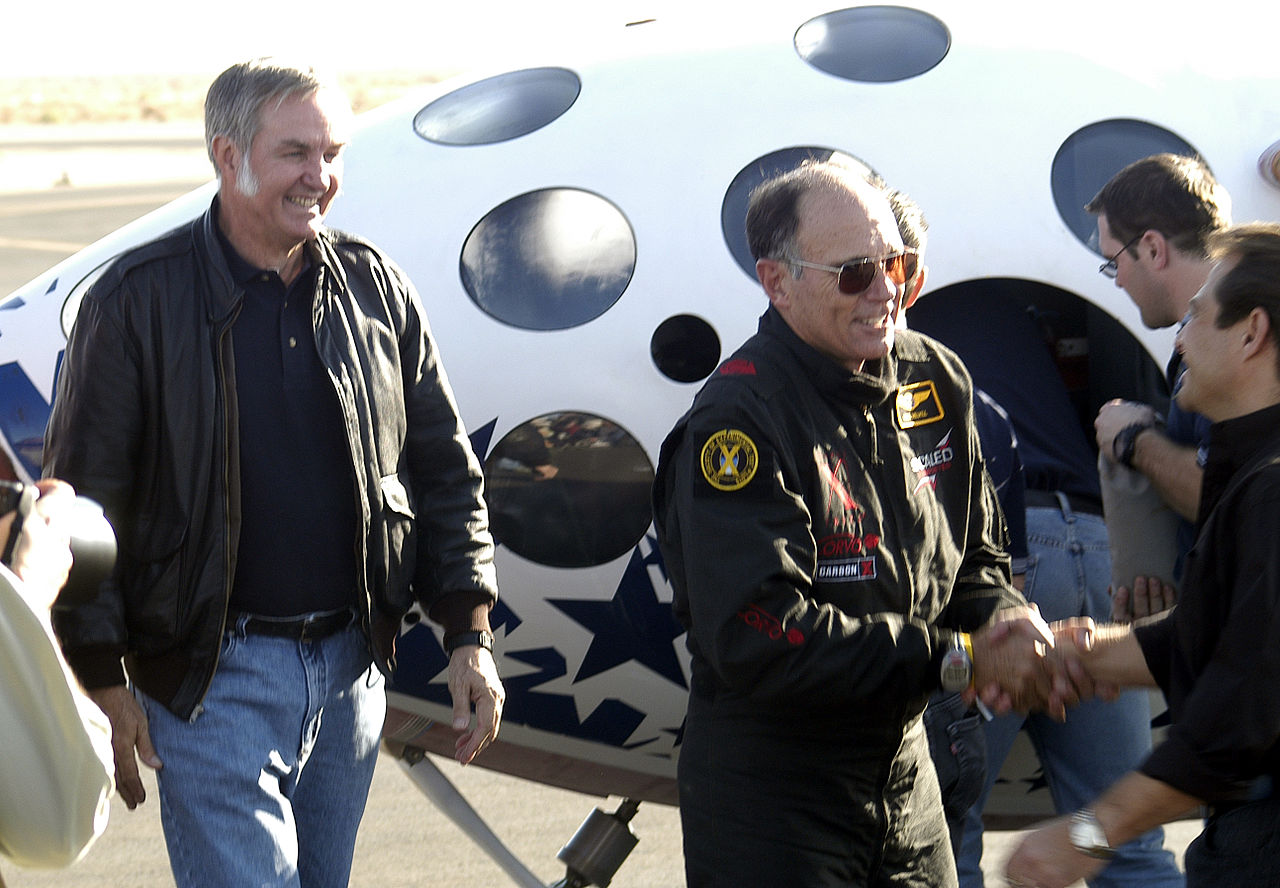 ![]() Melville (right) and Burt Rutan (left) in front of SpaceShipOne Flight 15P after landing. |