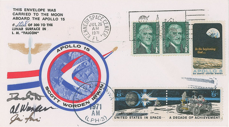 Back at their base, they collected the solar-wind experiment, after which Irwin produced a postal cover carrying a new stamp commemorating "a decade of achievement" in space, and applied a first-day cancellation provided by the Postal Service. A few minutes later Scott stood before the rover's TV camera to conduct a scientific demonstration: