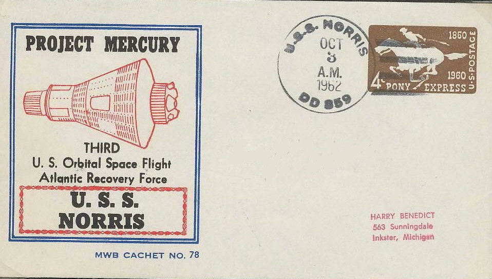 ![]() Second Recovery Ship "USS Norris" (DD-859) cancel. Credit: #410 |