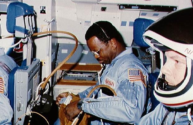 | STS-41-B - Astronauts McNair and Stewart prepare for reentry - Credit: NASA. 60,266 bytes. 622 x 622 pixels. |