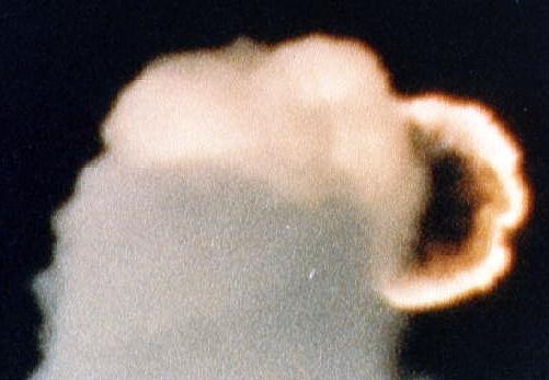 At 73.124 seconds,. a circumferential white vapor pattern was observed blooming from the side of the External Tank bottom dome. This was the beginning of the structural failure of hydrogen tank that culminated in the entire aft dome dropping away. This released massive amounts of liquid hydrogen from the tank and created a sudden forward thrust of about 2.8 million pounds, pushing the hydrogen tank upward into the intertank structure. At about the same time, the rotating right Solid Rocket Booster impacted the intertank structure and the lower part of the liquid oxygen tank. These structures failed at 73.137 seconds as evidenced by the white vapors appearing in the intertank region.