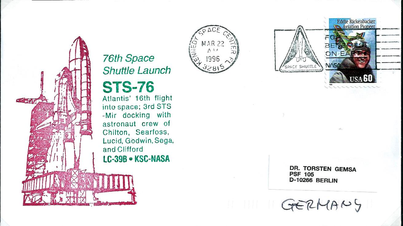 Shuttle-Mir Mission 3. Docked with the Mir space station 24 March 1996; Shannon Lucid was left on Mir for an extended stay. First American EVA on Mir. Payloads: SPACEHAB/Mir 03; KidSat; Shuttle Amateur Radio Experiment (SAREX) II, Configuration M; RME 1304—Mir/ Environmental Effects Payload (MEEP); orbiter docking system RME 1315; Trapped Ions in Space Experiment (TRIS); Extravehicular Activity Development Flight Test (EDFT) 04.