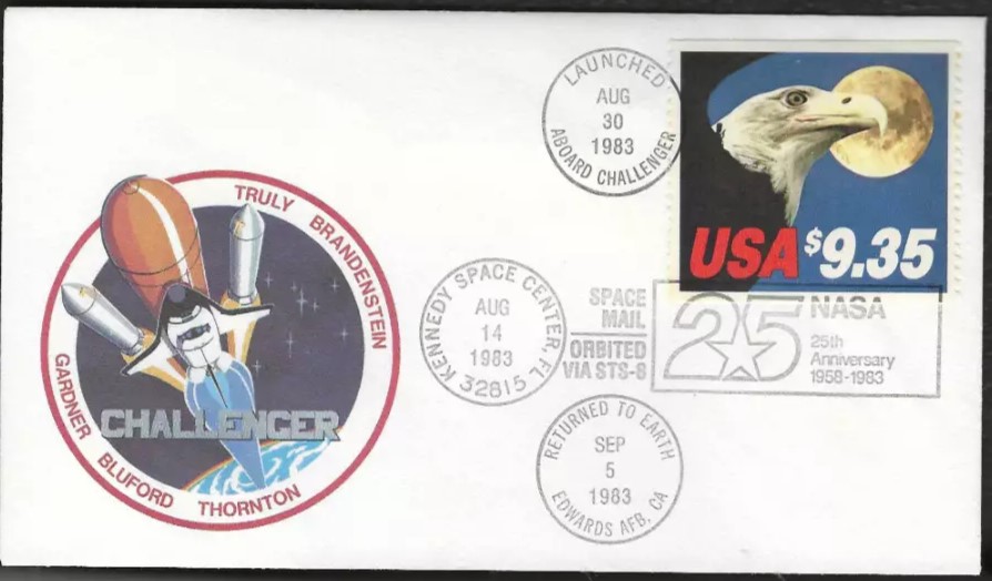 First night launch and night landing. Deployed Insat 1B. Payloads: Deployment of INSAT (lndia communica-tion satellite) with Payload Assist Module (PAM)-D, Payload Flight Test Article (PFTA)/ Payload Deployment Retrieval System (PDRS), Continuous Flow Electrophoresis (CFES), biomedical experiments. 250,000 express mail envelopes with special cachet for U.S. Postal Service were carried for a first-day cover.