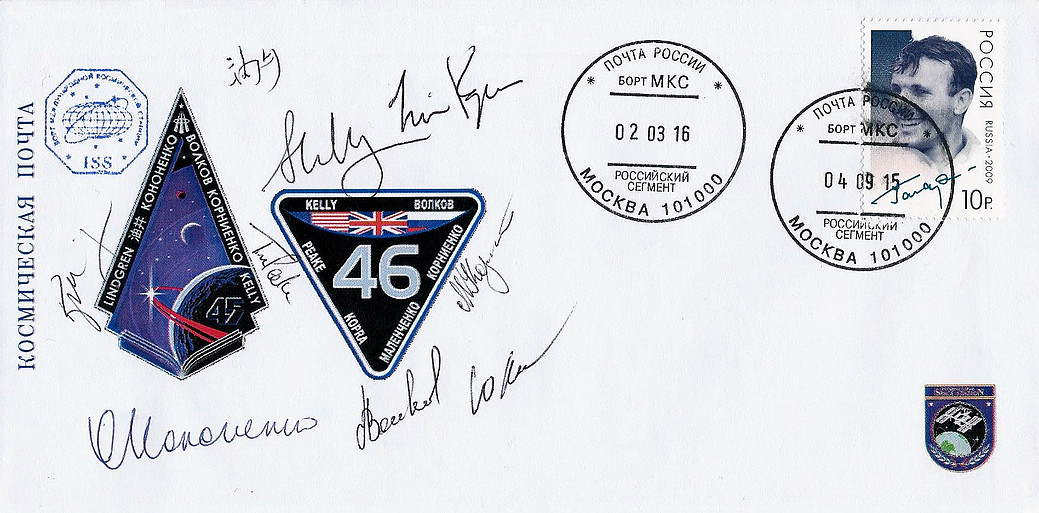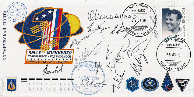 ![]() Kelly & Korniyenko 1 year long stay in space, cancel undocking, ISS board cancel, signed by the crew ISS43-46. |