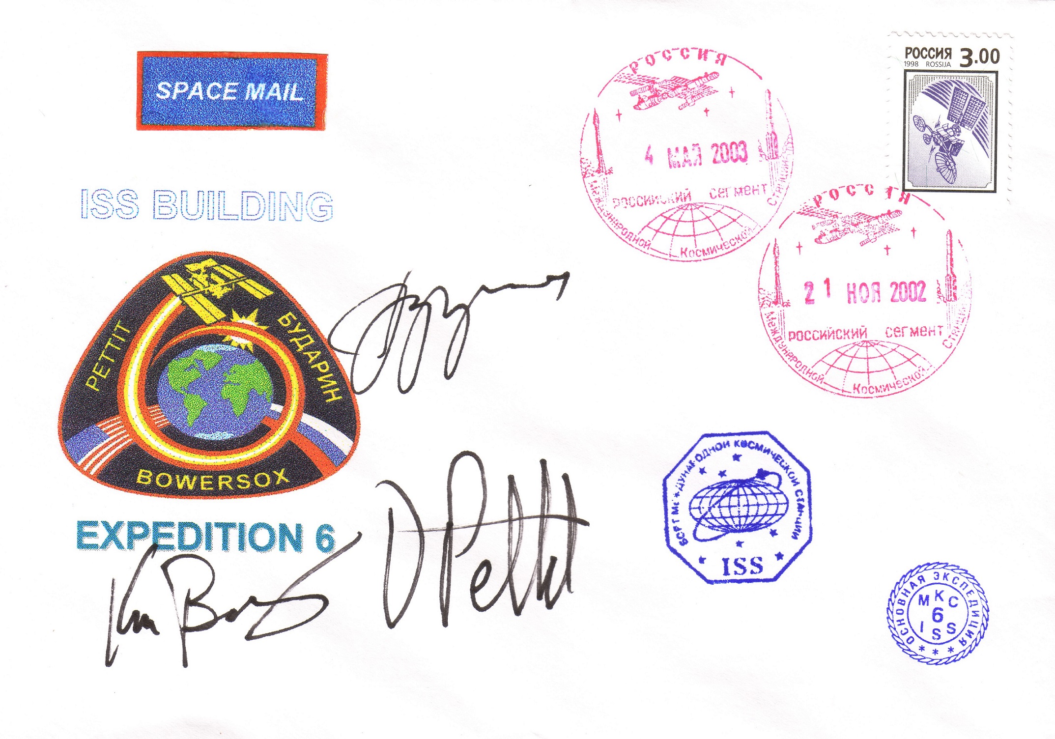 ![]() Cosmic Mail: Cover with bleu extagonal ISS cancel, special red flight cancels and bleu MKC6, signed by the crew. |