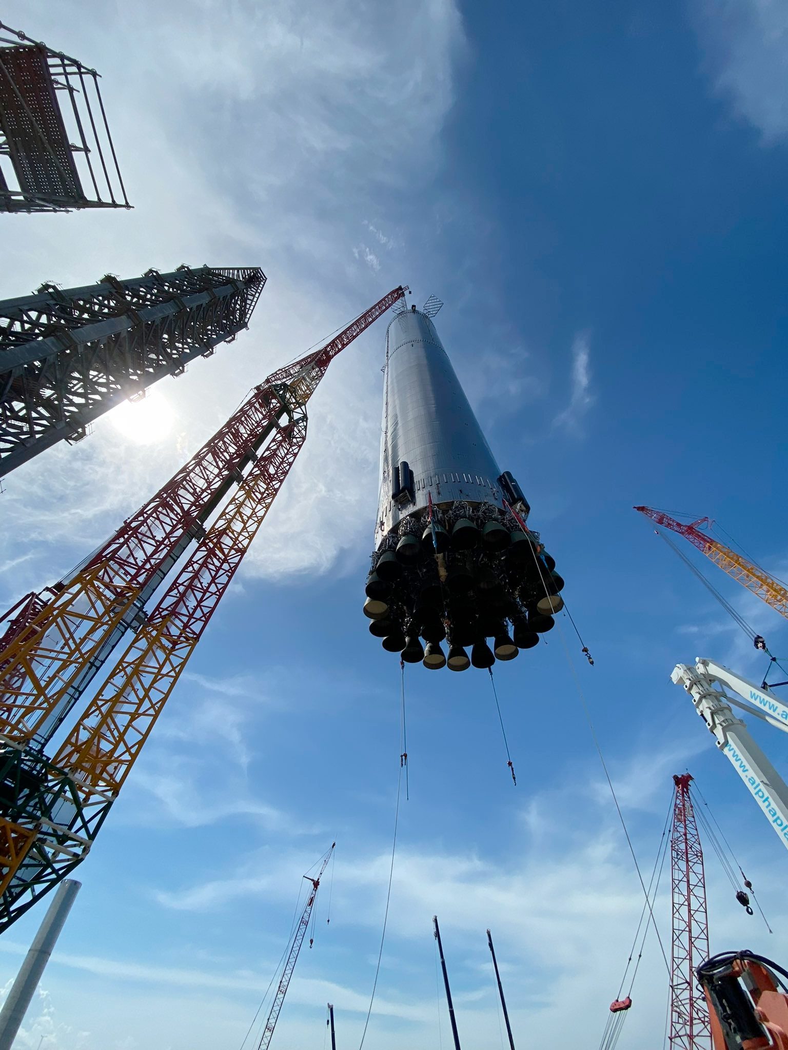 ![]() Starship SN20 standing tall on Booster 4 at the Starbase orbital launch platform. |